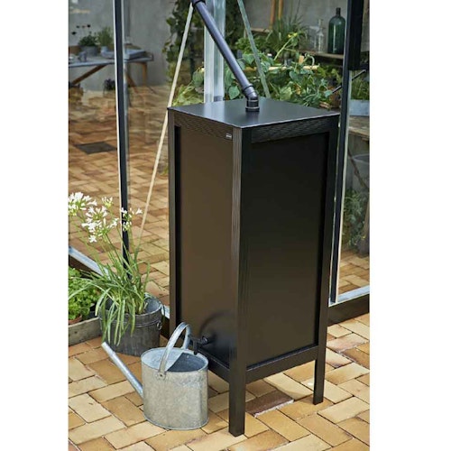 Juliana Wasserspeicher für Gewächshäuser. Der Regenwassertank lässt sich an die Dachrinne anschließen und sammelt das Regenwasser zum späteren Gebrauch. Dank des Zapfhahns unten können Sie eine Gießkanne ganz einfach mit kalkarmem Regenwasser befüllen.